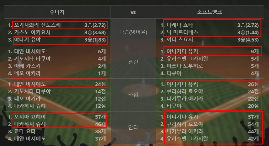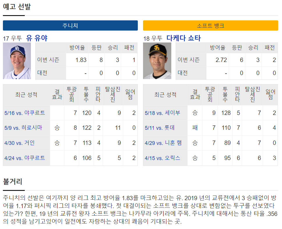 최악의 득점력을 가지고 있지만, 최고의 투수력으로 버티고있는 주니치. 반편 소뱅은 거센 화력을 앞세워 6승2무2패를 기록하며 기세가 뜨겁다.
