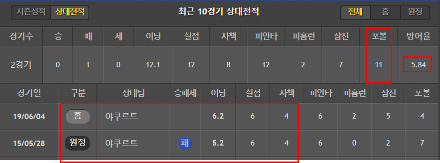2번의 통산 맞대결전적은 상당히 좋지 못했다. 역시나 볼넷이 문제였다.