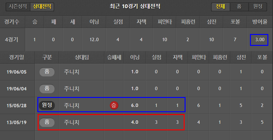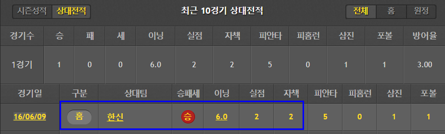 원정 5.09로 홈 2.25와 차이가 너무 많이 난다. 이번경기는 원정이기때문에 호투를 예상하긴 꺼려진다. 부진, 호투, 부진을 반복하고 있는 모습이 좋은 모습은 결코 아니다. 신인급투수답게 맞대결 전적은 없다.