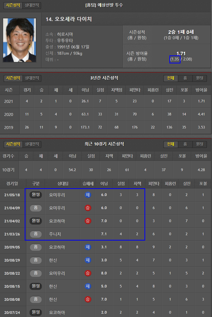 홈원정 차이가 없는 니시유키. 개막과 동시에 쾌조의 스타트를 하다가 최근 2경기 연속 불안한 모습을 보이고 있다.