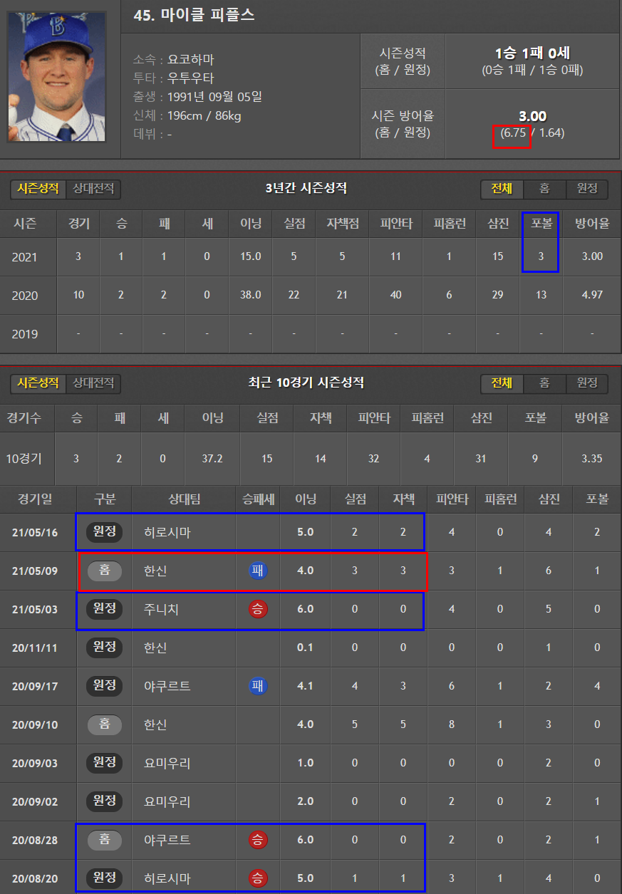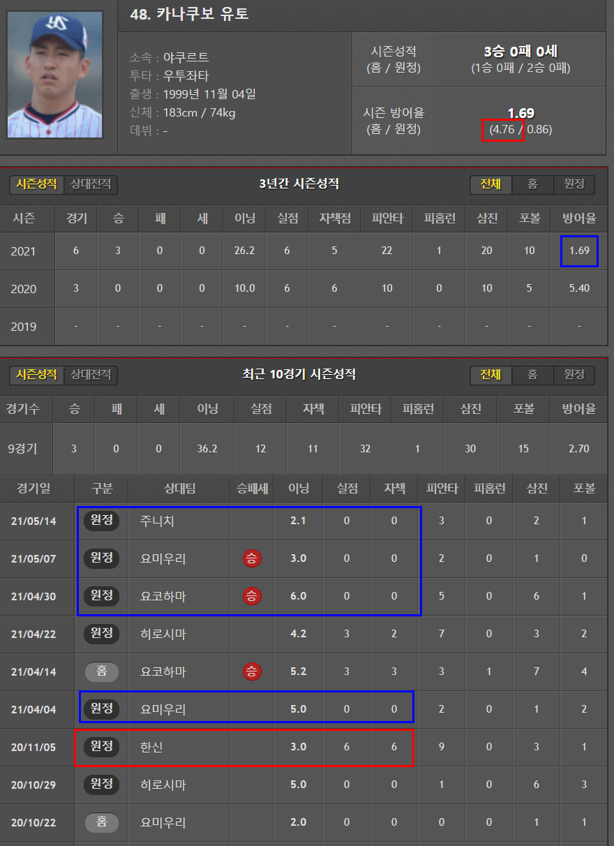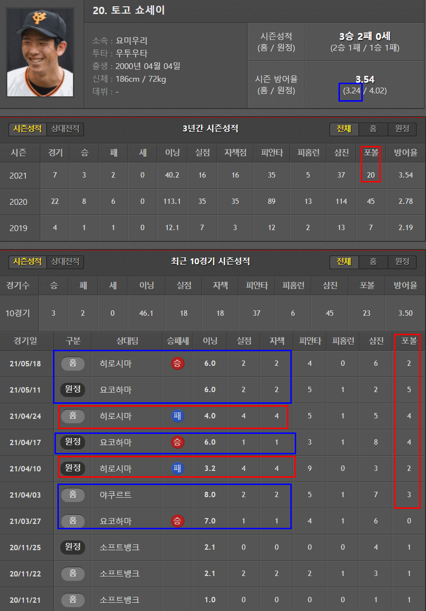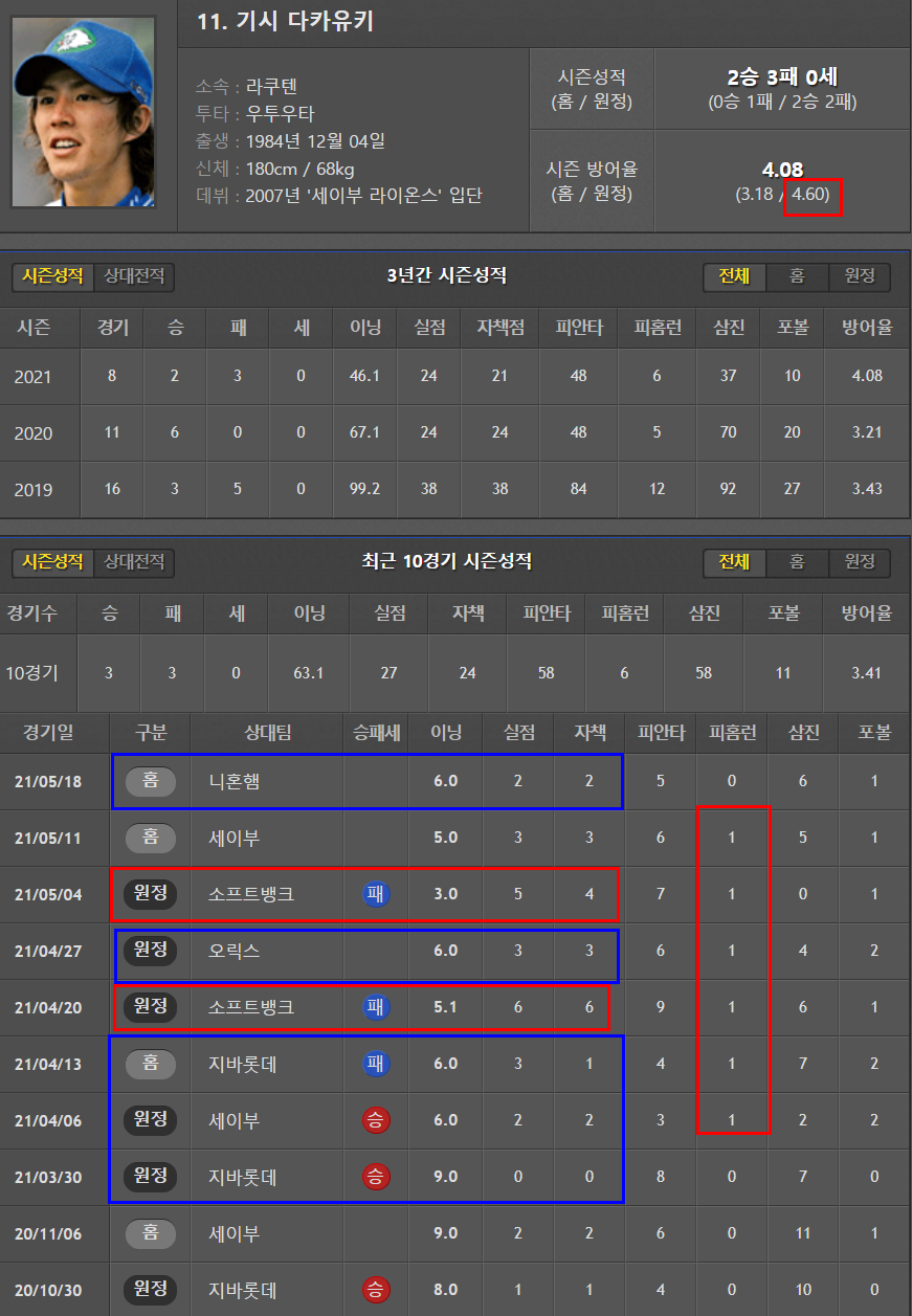 - 원정경기 4.6평자로 흔들리는 모습. 그래봐야 6이닝 3실점 페이스긴하지만.. 투고타저인 이쪽동네이서 호투라고 하긴 좀 뭐하다. = 난조 가능성 ↑