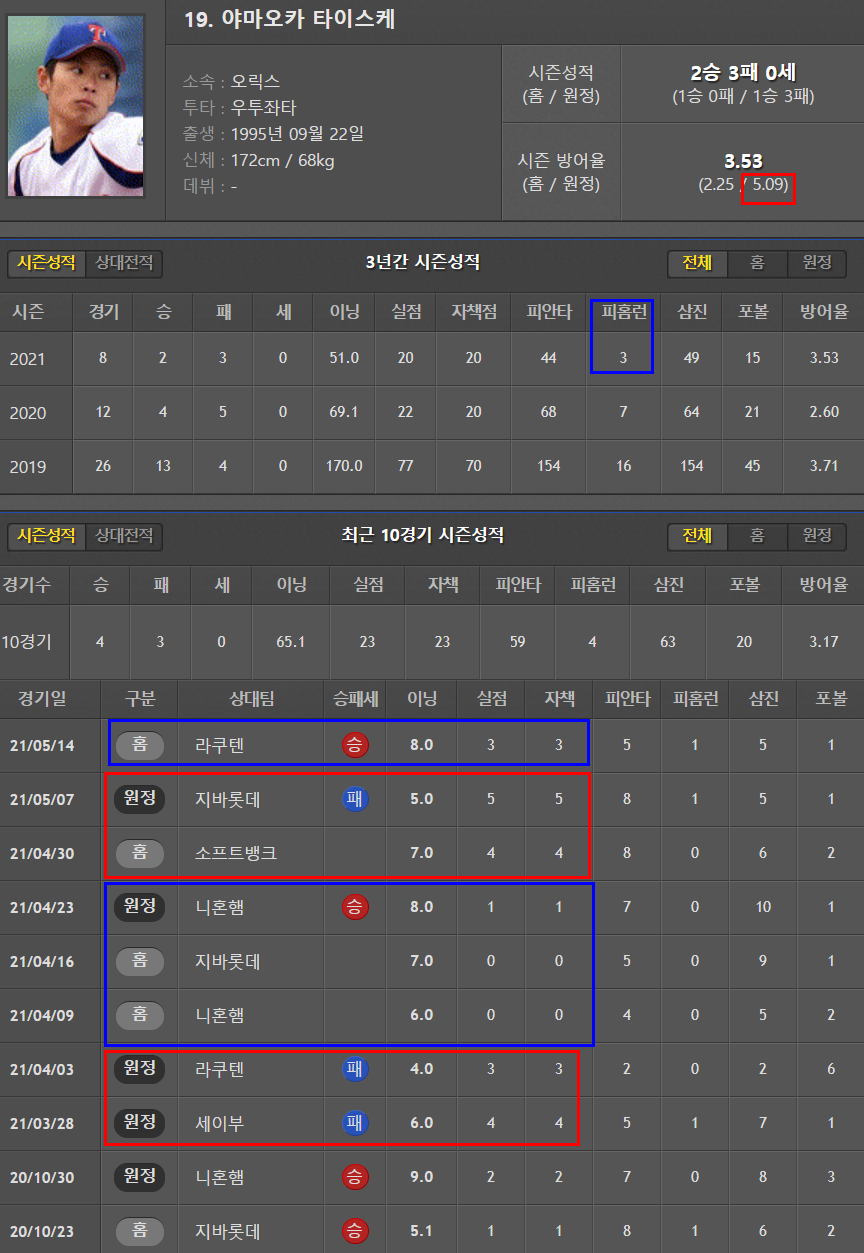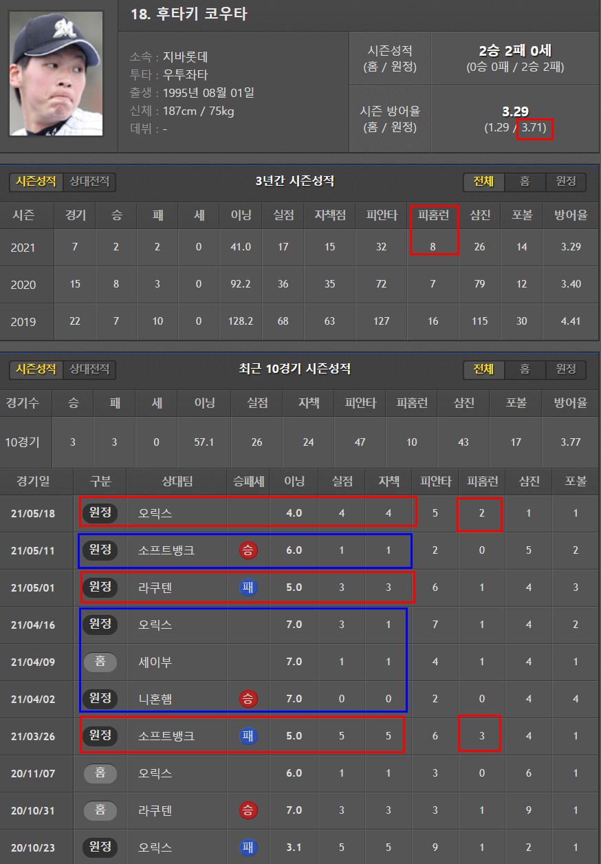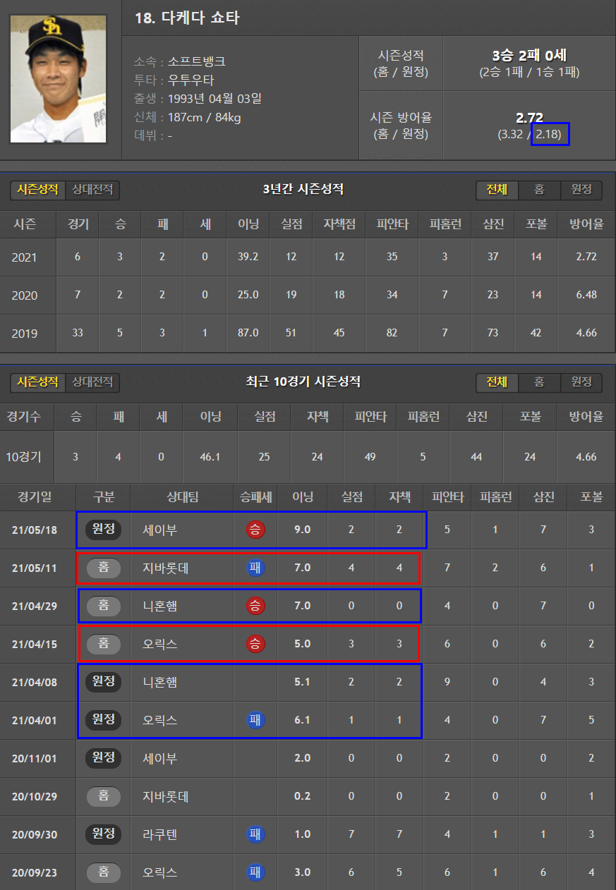 - 원정경기 4.6평자로 흔들리는 모습. 그래봐야 6이닝 3실점 페이스긴하지만.. 투고타저인 이쪽동네이서 호투라고 하긴 좀 뭐하다. = 난조 가능성 ↑