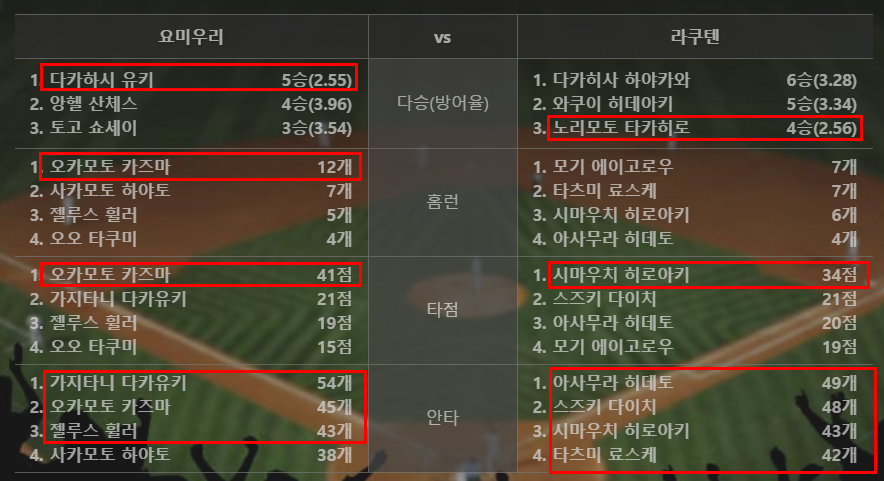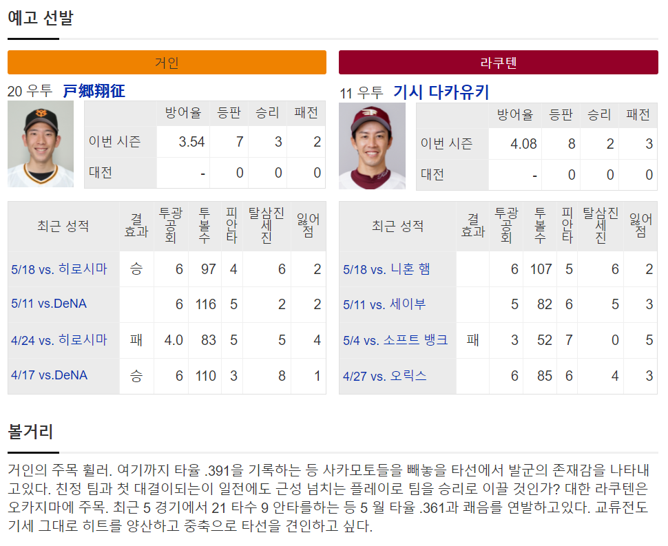 2점대 자책점의 선발투수를 한명씩 보유하고 있으며, 요미우리가 역시 홈런과 타점에서 중심을 잡아주는 선수가 있는 반면 라쿠텐에는 비교적 컨택위주의 타자들이 포진되어있는 느낌이다.