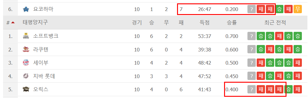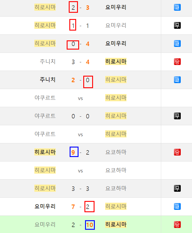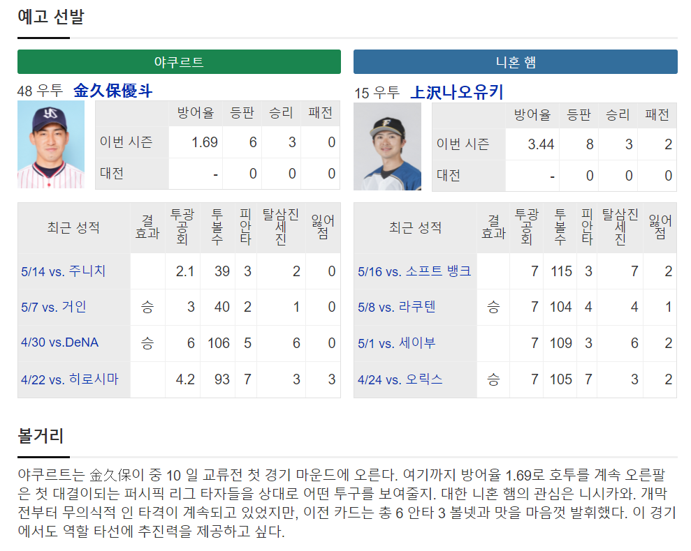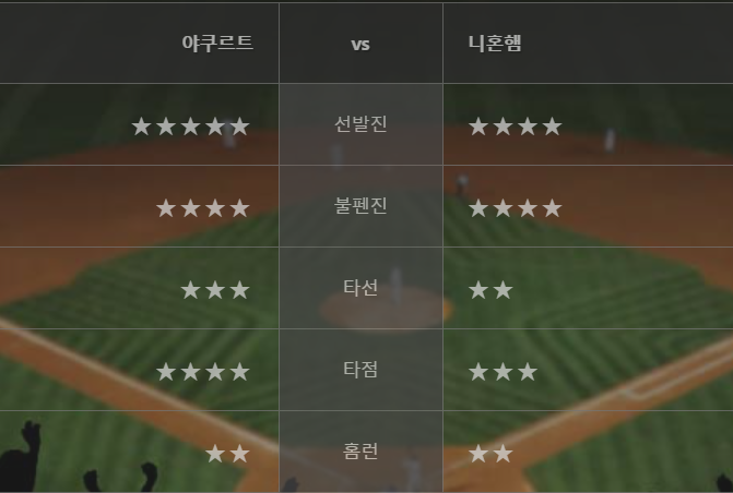최근 득실점을 보면 야쿠르트와 니혼햄의 차이가 극명하다. 니혼햄은 지난 경기전까지 10경기 20득점에 그치는 최악의 득점생산력을 자랑하고 있었다.(직전경기 로또 10득점)
