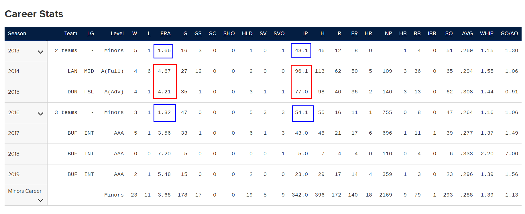 마이너 7시즌을 뛰었고, 데뷔시즌인 13년과 16년 50이닝가량 소화하면서 1점대의 평자를 기록했고, 마이너 통산 3.68의 좋은 기록을 남겼지만 마지막 세시즌의 흐름만 본다면 반등하지못하고 기록이 점차 나빠졌다.