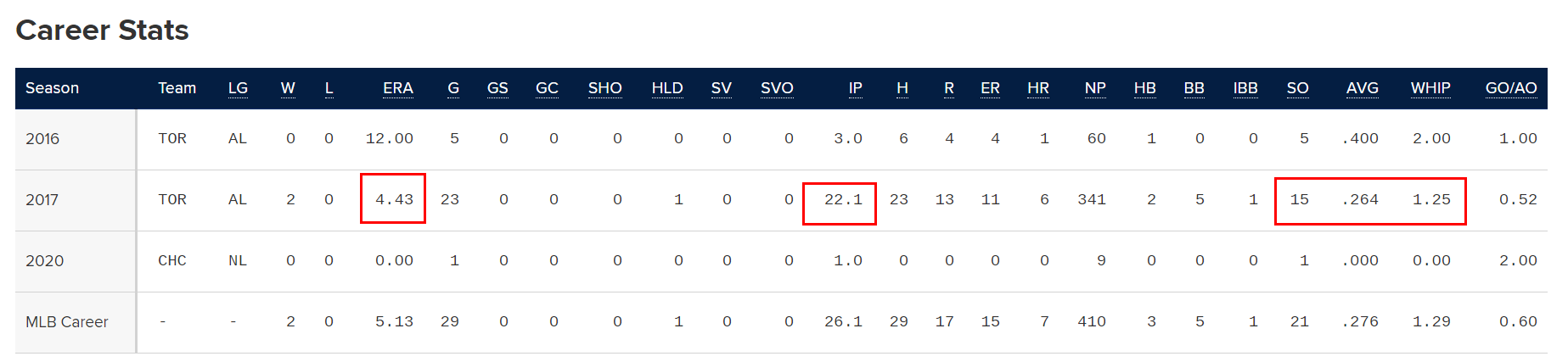 17년 22.1이닝 평자 4.43이 커리어 하이기록.