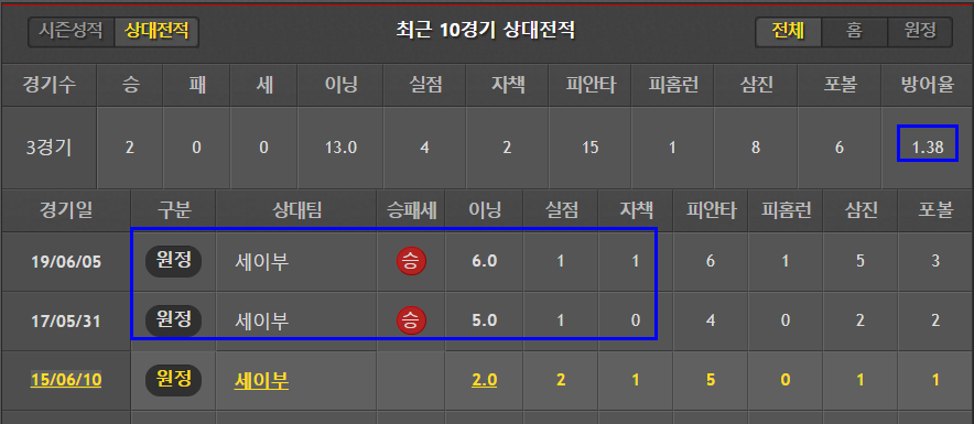 오래된 고대전적이긴하지만 요미우리 상대로는 매우 좋은 모습을 보였다.