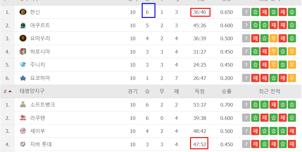 최근 6승 1무 3패를 기록중인 한신의 득실점은 독특하다. 20득점으로 6승을 일궈냈고 31점을 3패로 처리하면서 매우 효율적인 경기운용으로 승리를 가져갔기때문에 실점이 많다고 볼수도 없다.