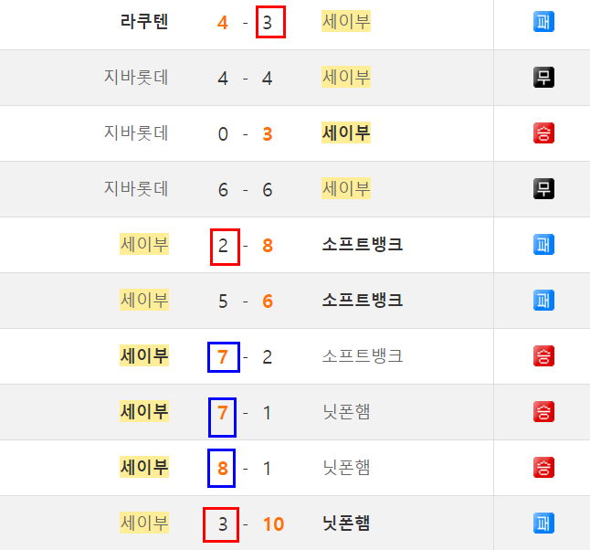 세이부는 닛폰햄에기 진 직전경기가 충격이다. 공교롭게도 히로시마 역시 10-2로 크게 이겼다. 한가지 변수는 히로시마는 코로나로 인해 3일을 푹쉬었다는 점. 투수력을 이용해 확실하게 걸어 잠글 가능성이 크다.
