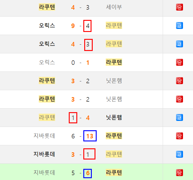 최근 득실률은 서로 비슷하지만 라쿠텐이 2승을 더 가져가 성적이 더 좋은 편이다.