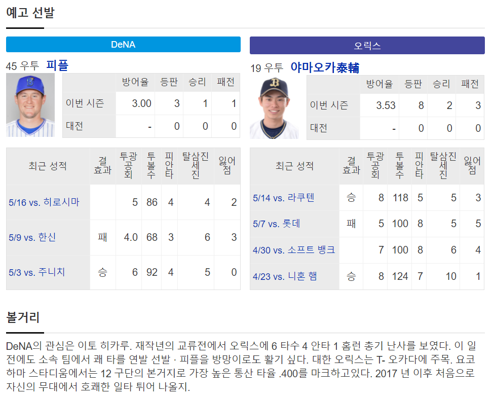요코하마 베이스타즈(홈) VS 오릭스 버팔로스(원정)