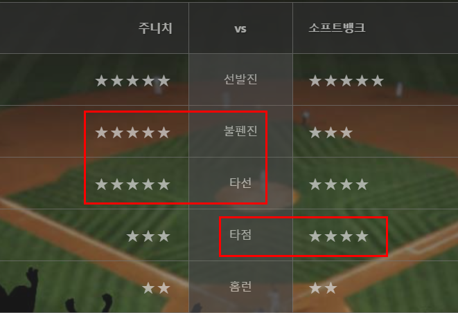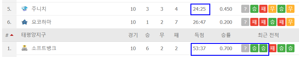 양팀의 극명한 온도차를 느낄수있다. 6득점이상 경기가 없는 주니치. 기세의 소뱅.