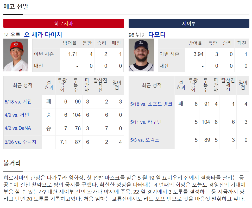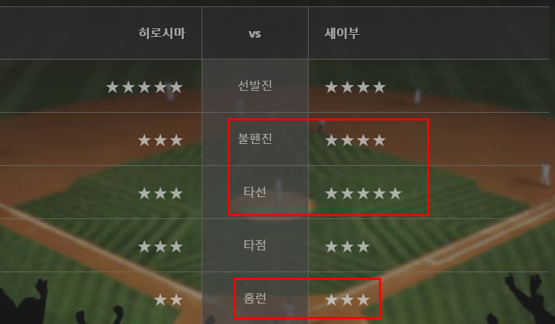 양팀 모두 확실한 팀컬러가 있다. 히로시마의 앞서는 투수력과 빈곤한 타력, 세이부의 앞서는 타력과 부족한 투수력.