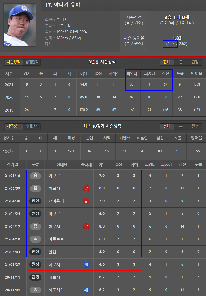 전국구 야나기가 출전한다. 홈 자책점 1.24 무적의 야나기가 홈 등판한다. 이런날 이기지 못하면 주니치는 가망이 없다. 무려 '54이닝' 33피안타 4피홈런 67삼진. 압도적인 성적이다. 맞대결기록은 없고, 더이상 설명이 필요없는 투수다. 개막전 부진한뒤로는 7경기 연속 미친 질주를 이어가고있다. 내일도 털려봐야 6이닝 2실점 정도할것이다.