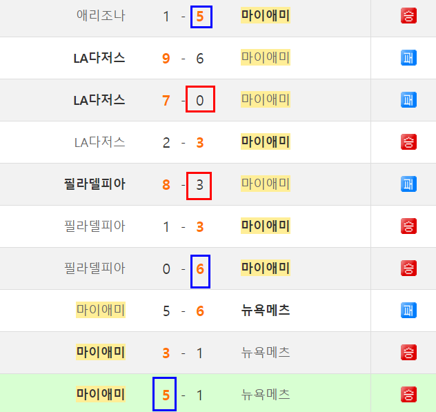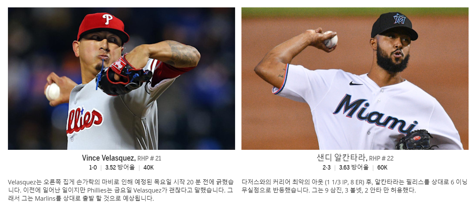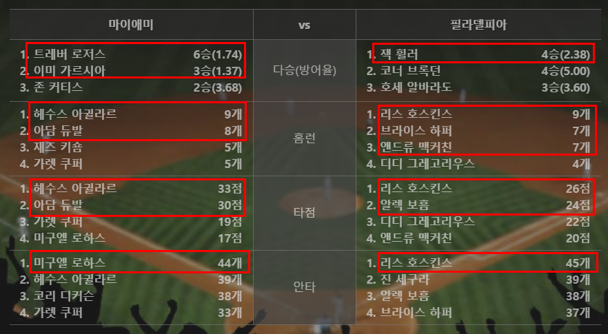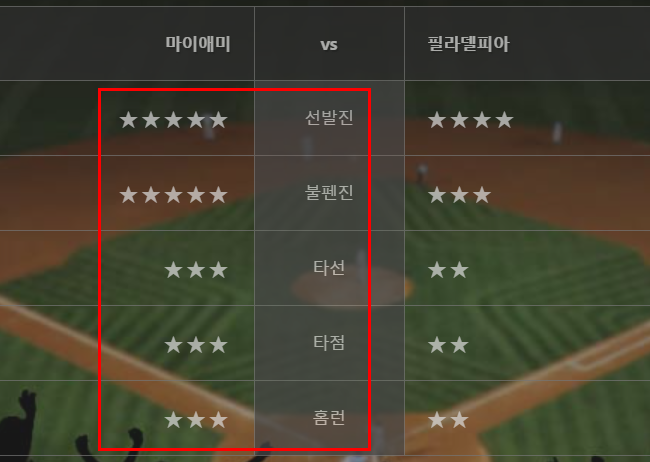1점대 평자 선발 2명. 타선은 조~금 더 마이애미가 좋아보인다.
