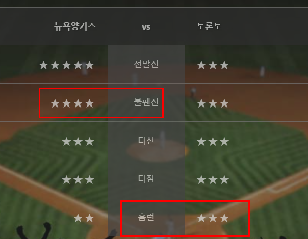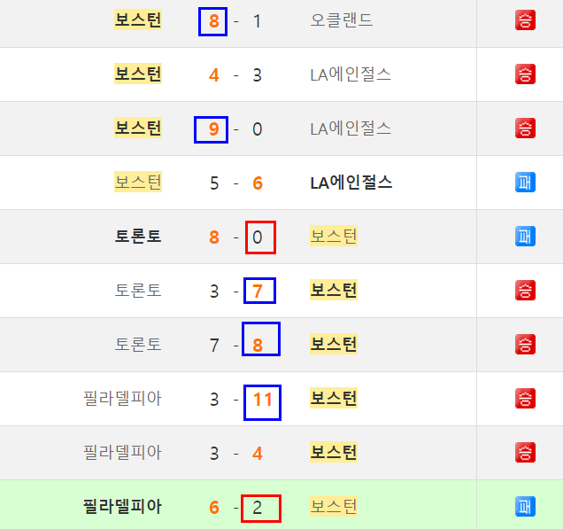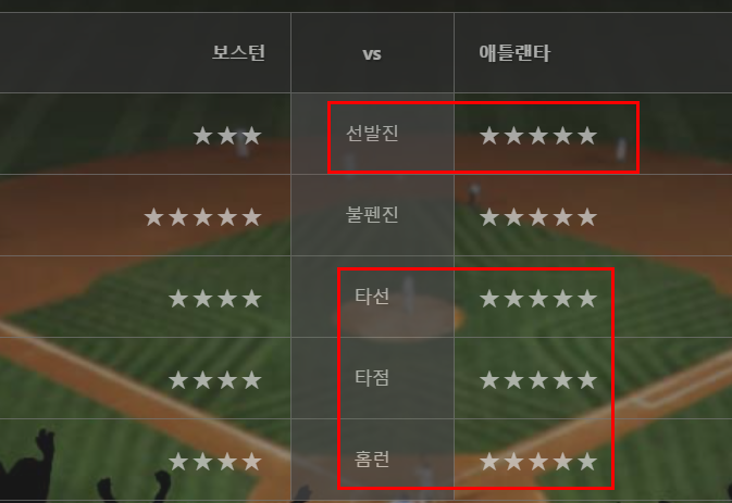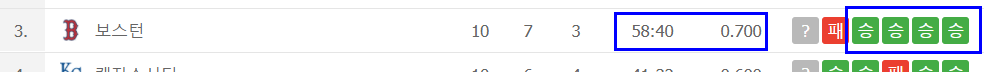 그래도 타선은 보스턴이 좀 더 뜨거워보임. 왜냐면.. 투수들 평자보면 3점대이상인데도 5승씩하고 있잖..