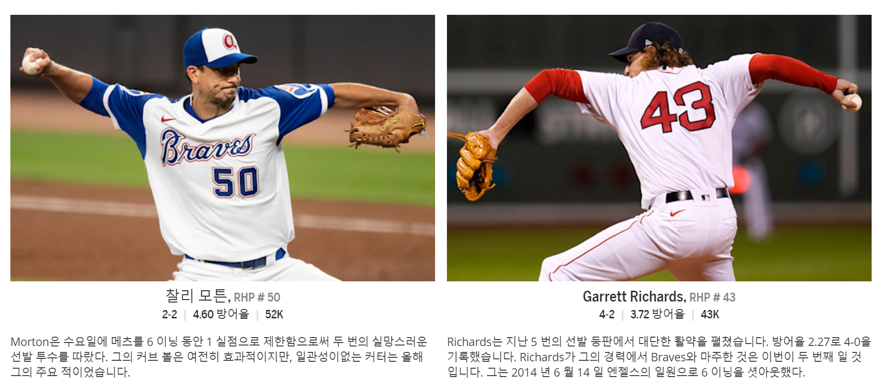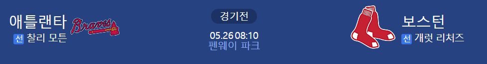 상승세의 두팀이 만났다. 선발 데이터만 비교했을때 보스턴 개럿 리차드 우위로 앞서고 있으며, 모튼도 종종 호투하긴 하지만 흐름이 좋다고 할수는 없다. 최근 약팀과의 7연전(메츠, 피츠버그)에서도 승리가 신통치 않았던 애틀랜타와 달리 보스턴이 거둔 승리의 가치가 좀 더 높은만큼 보스턴의 기세 좋아, 보스턴 승리를 점쳐본다.