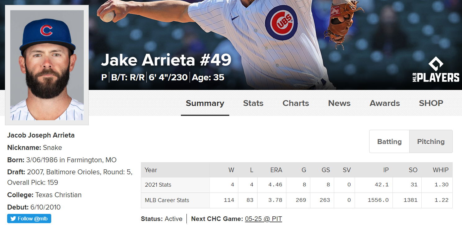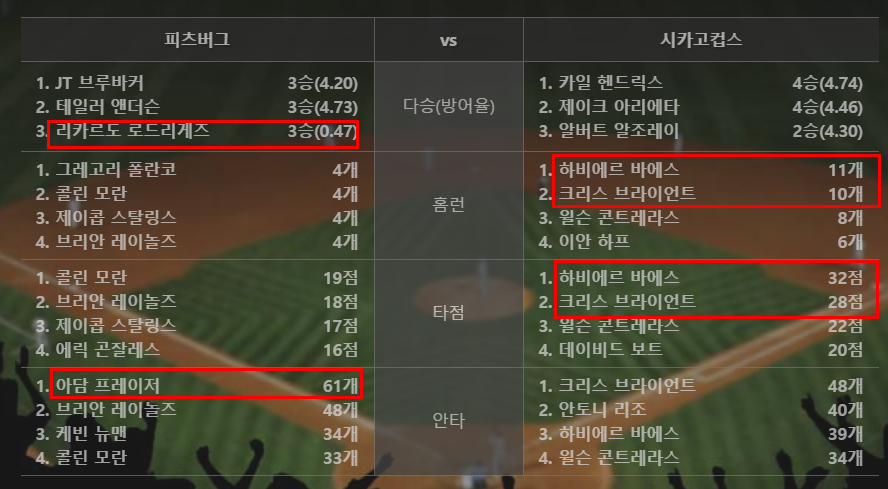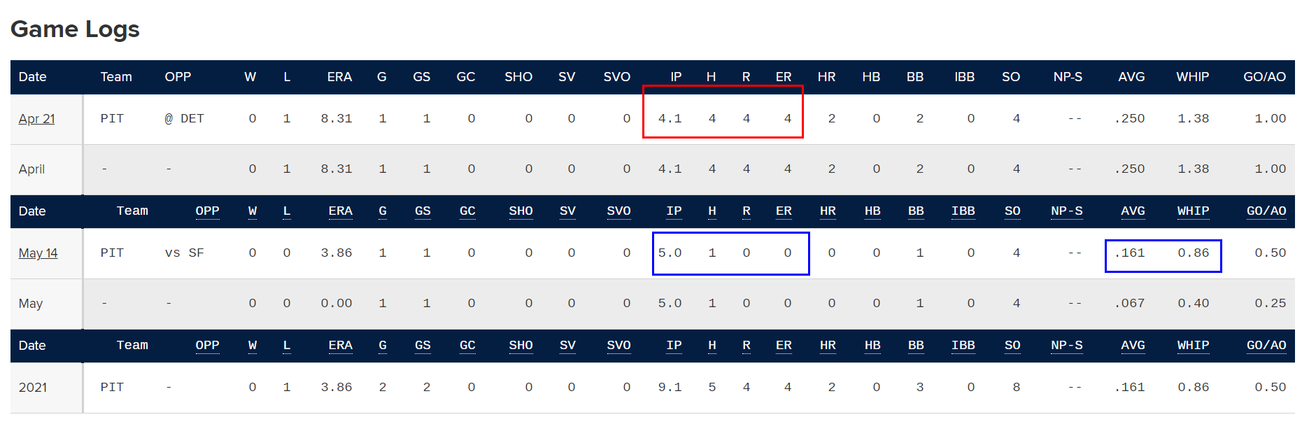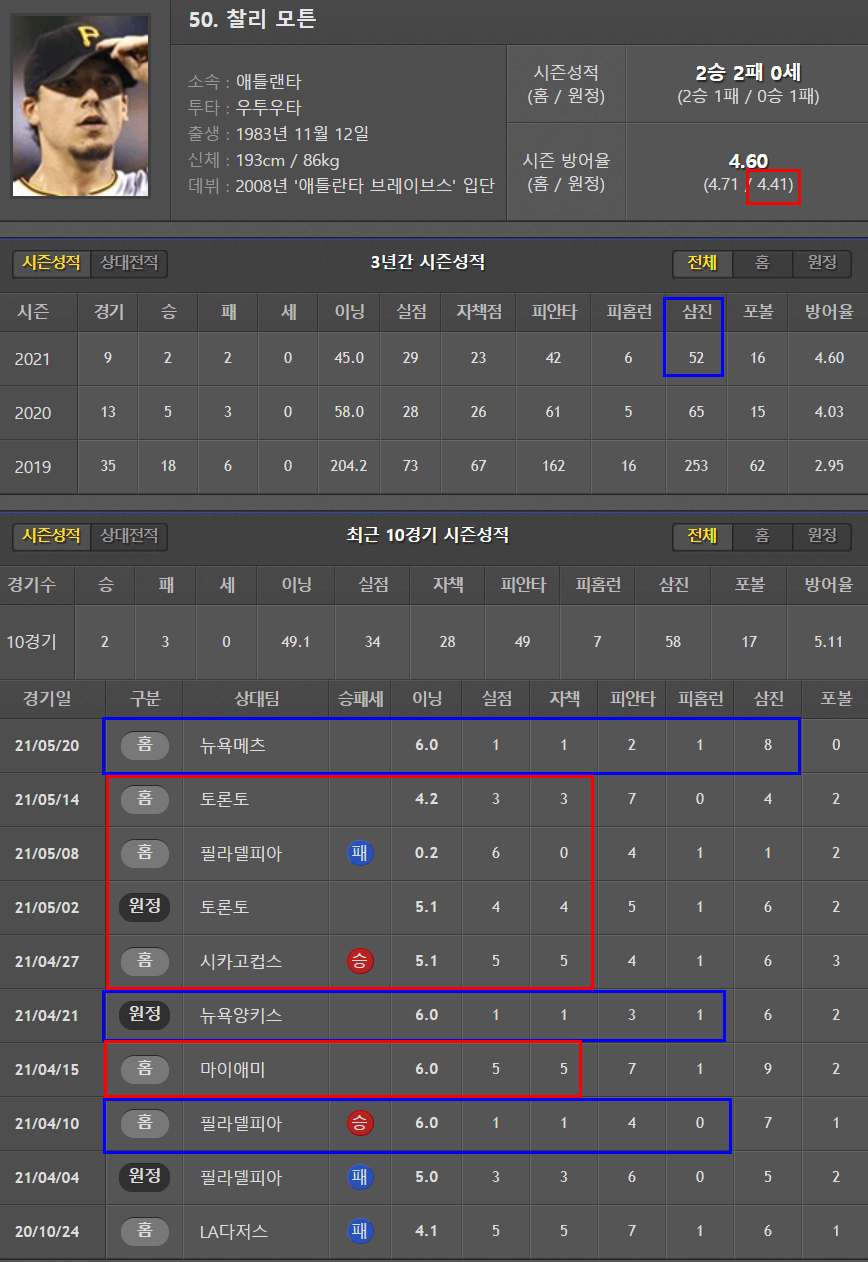 개막후 호투를 이어가다 최근 롤러코스터 탑승중이다. 헣허.. 하지만 개막 직후 2경기는 모두 피츠버그와의 경기였다. 상대전적이 좋을수밖에 없다.