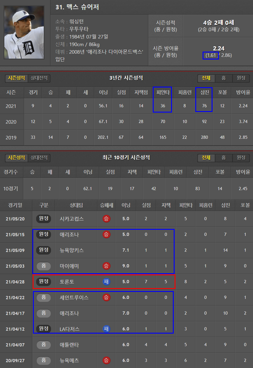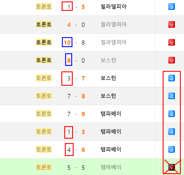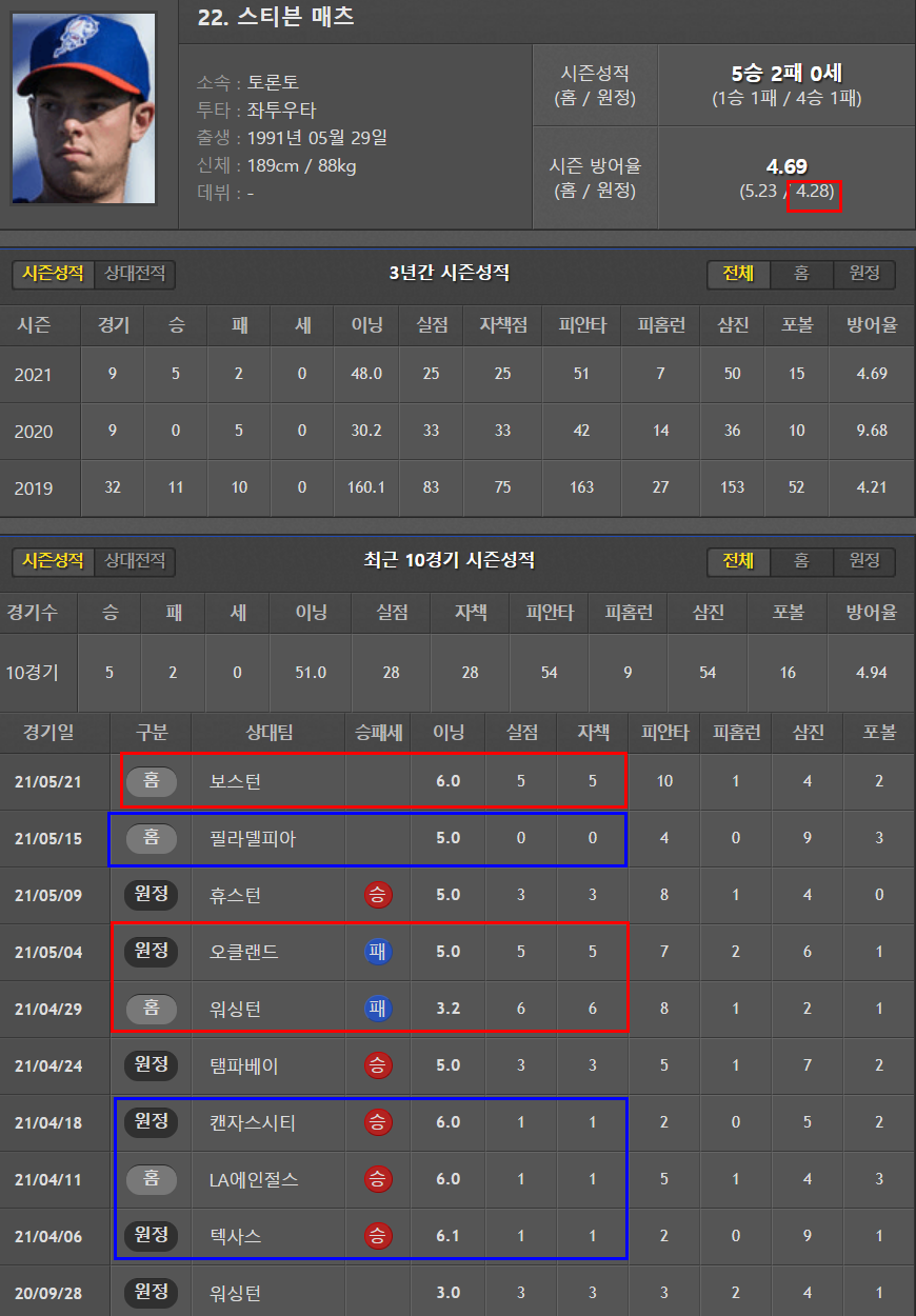토론토 다승 1위.(니까짓게?ㅋㅋ) 대체로 강팀을 만나면 털렸던 기록들. 그래도 5~6이닝은 계속 소화해주고 있지만 최근 흐름이 너무 좋지 않아보인다.