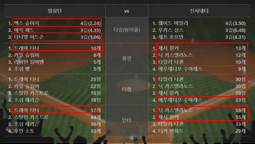 선발진이 탄탄한 워싱턴 / 신시의 타격도 순위로보면 상당해보인다.
