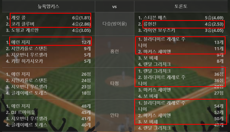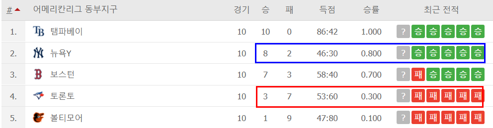 토론토의 53득점에도 불구하고 3승 7패... 반면 양키스는 46득점으로 8승 2패를 기록하며 순항하고 있다.