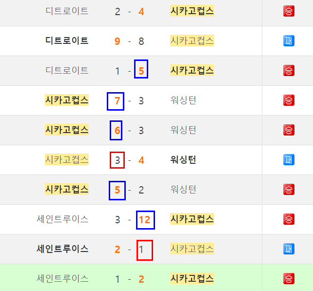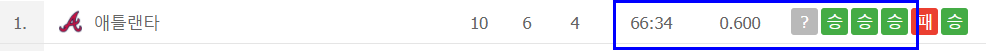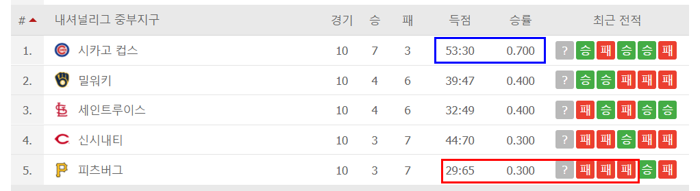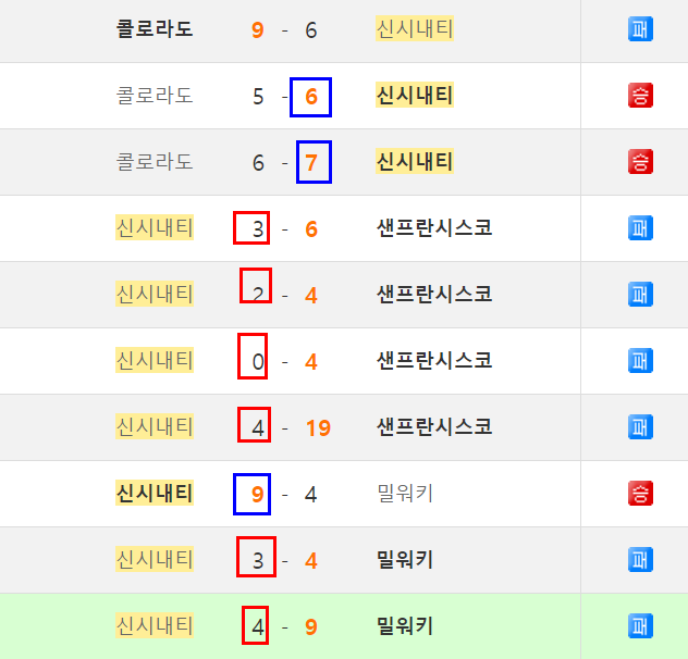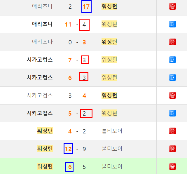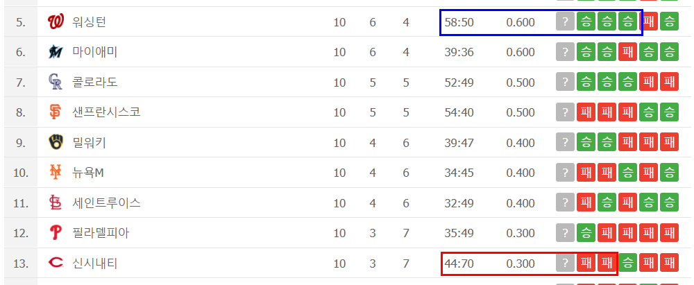 실점이 너무 많은 신시내리~ 3승 7패로 너무 안좋다. 반면 워싱턴의 흐름이 좋다.