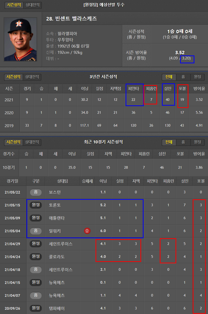 벨라스케즈 최근 기록이 좋아보인다. 조기강판했던 직전경기는 알아보기 귀찮았지만.. 승률을 올리기위해 수색...