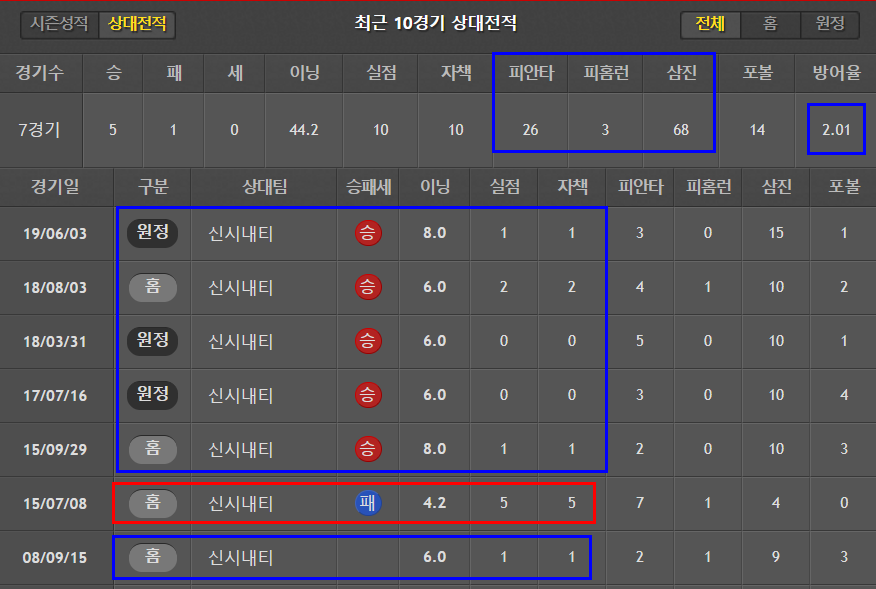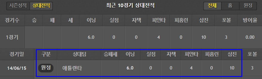 단 한차례 14년도..; 고문서에 따르면 6이닝 무실점 10삼진의 아름다운 투구를 했었다고.. 그때도 볼넷 3개는 달고다녔구나..