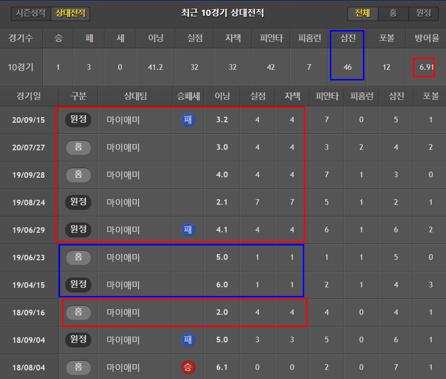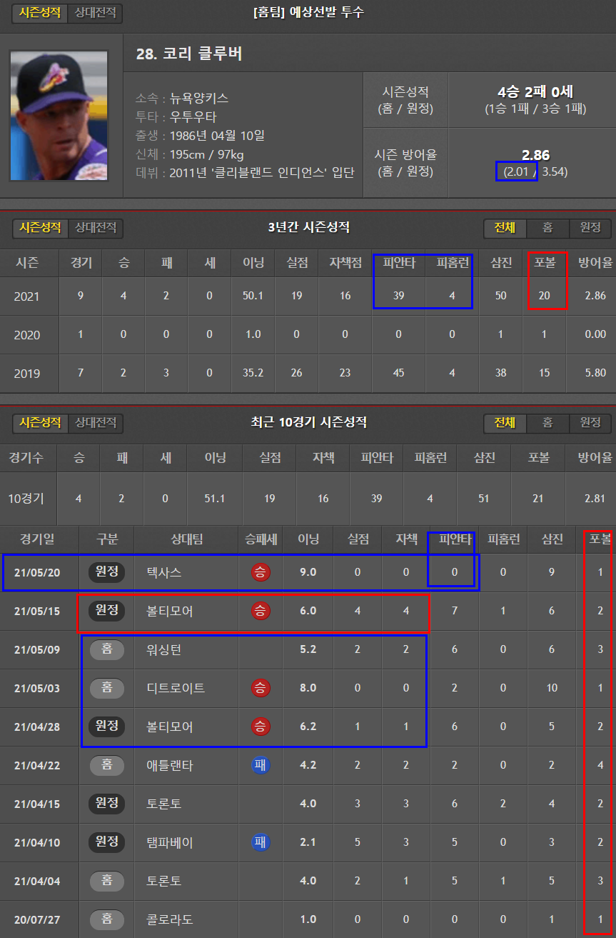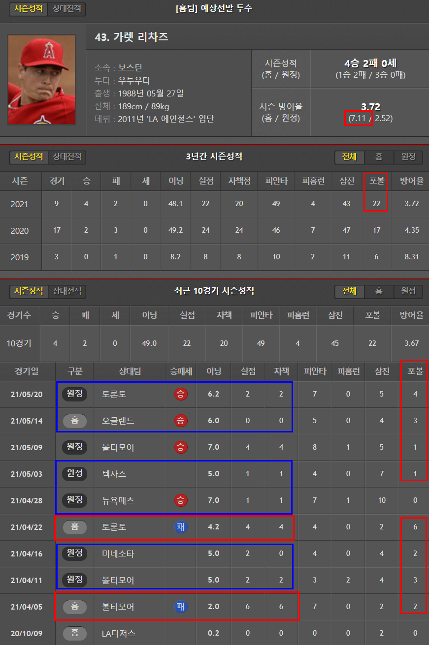 홈 7.11로 좋지 않지만, 시즌 초의 상태가 안좋았을때의 얘기며, 최근 5경기 기록은 아주 좋은편. 단, 볼넷이 너무 많다.