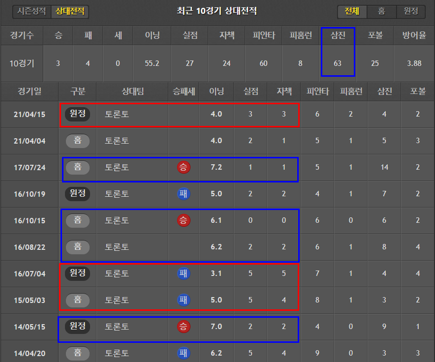 역대 토론토 전적은 평범했다. 올시즌 2번의 맞대결에서 모두 홈런을 맞으며 4이닝밖에 소화하지 못한부분은 아쉽다.