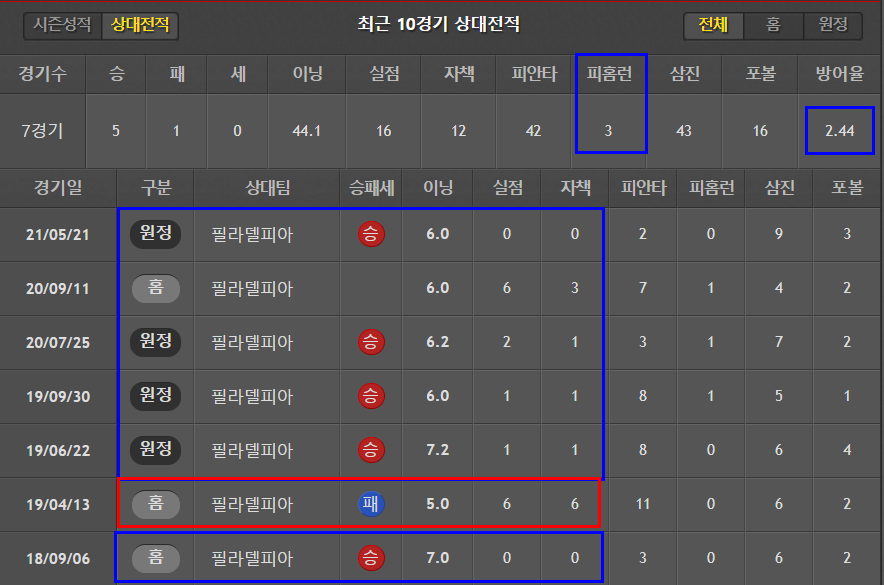 역대 필리스 전적또한 아름답다. 44.1이닝동안 피홈런을 3개밖에 허용하지 않으면서 완벽한 필리사냥꾼이 되었다.