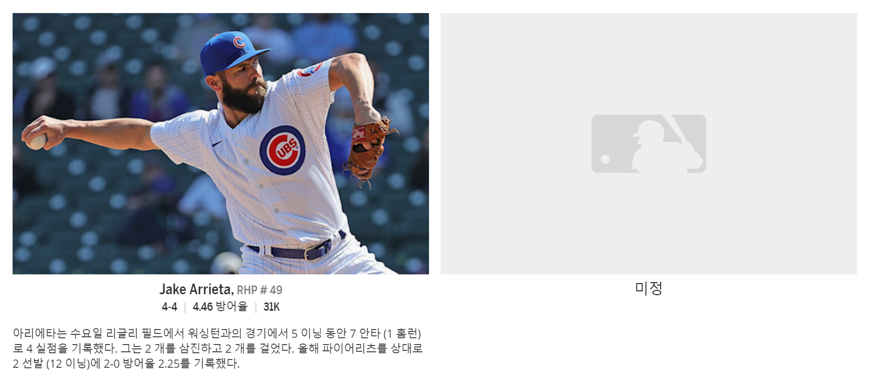 최근 부진한 아리에타지만, 피츠버그상대로는 매우 좋았다. 피츠타선 또한 그로기상태. 땜빵선발 야주레(?)가 호투한다해도 6이닝이상 소화하긴 어렵다고 보여지며, 이어진 피츠 불펜이 컵스타선을 봉쇄할 여력도 부족하다 보여진다. 이런 경기는 과감하게 컵스 핸승