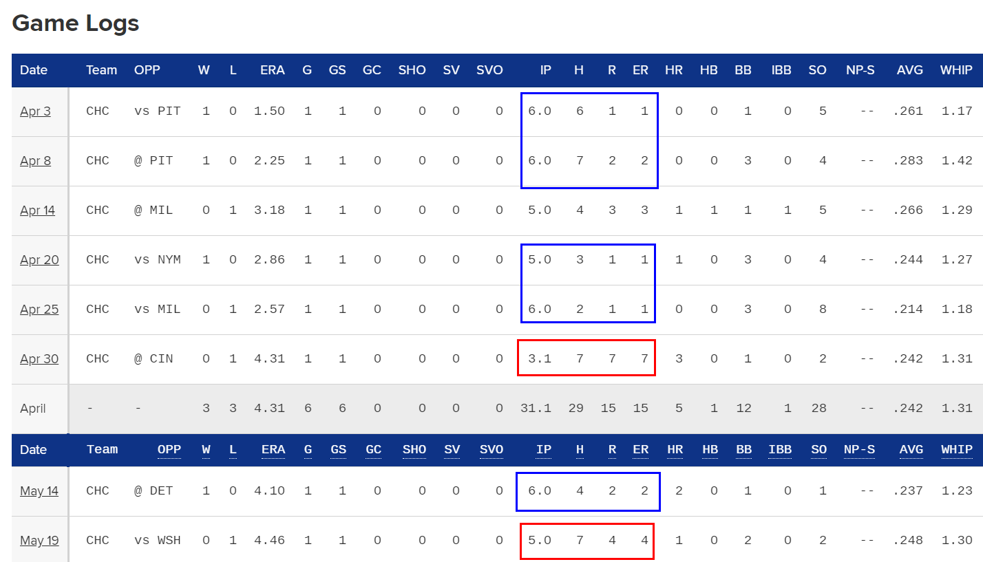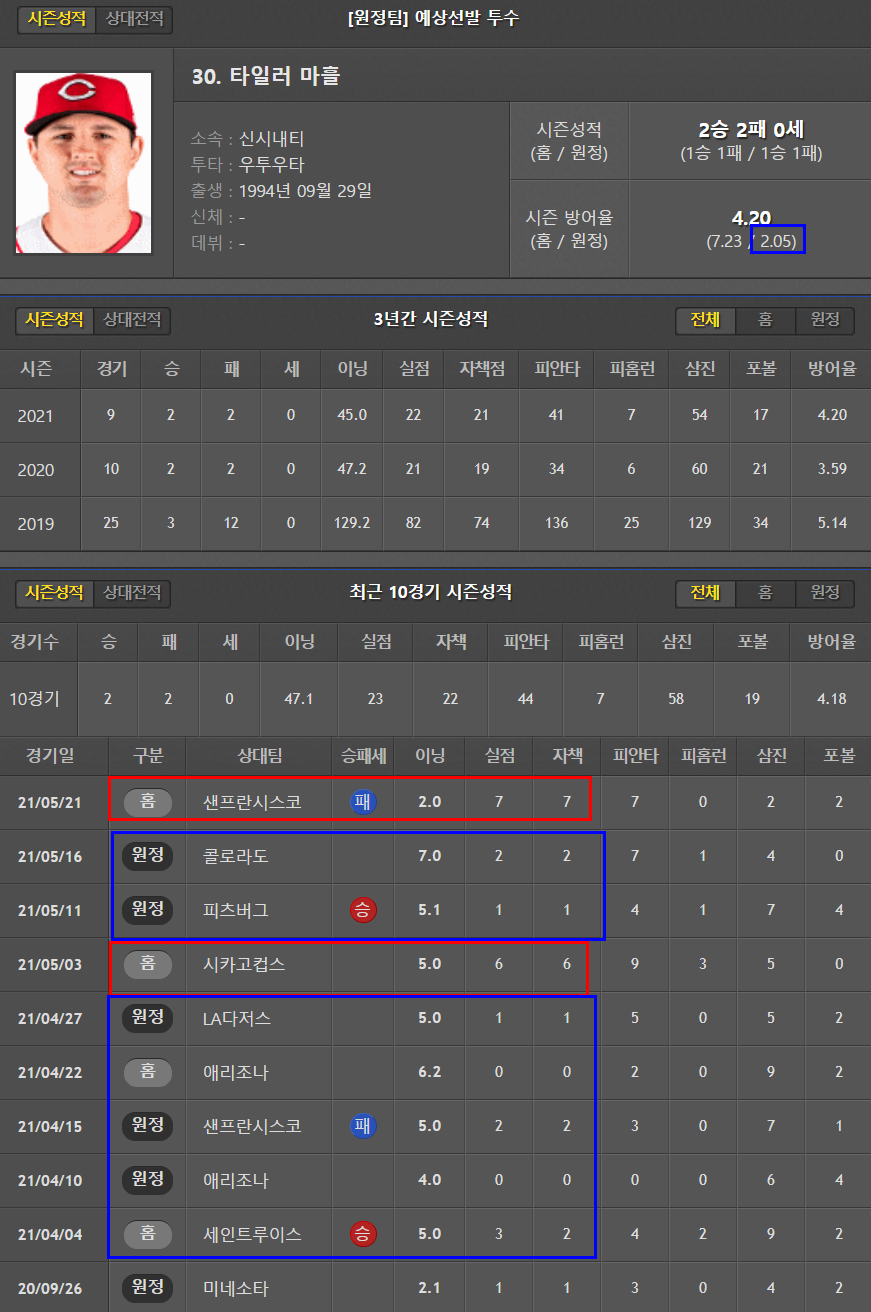 마플의 원정 자책점은 2.05로 놀랍다! 샌프와 컵스에게 털린 2경기가 모두 홈이니까, 강팀을 상대로 매우 흔들릴만했다고 볼수있다. 이점을 제외하면 딱히 볼넷이 조금 많은거 빼곤 매우 양호한 피칭을 이어가고있다.