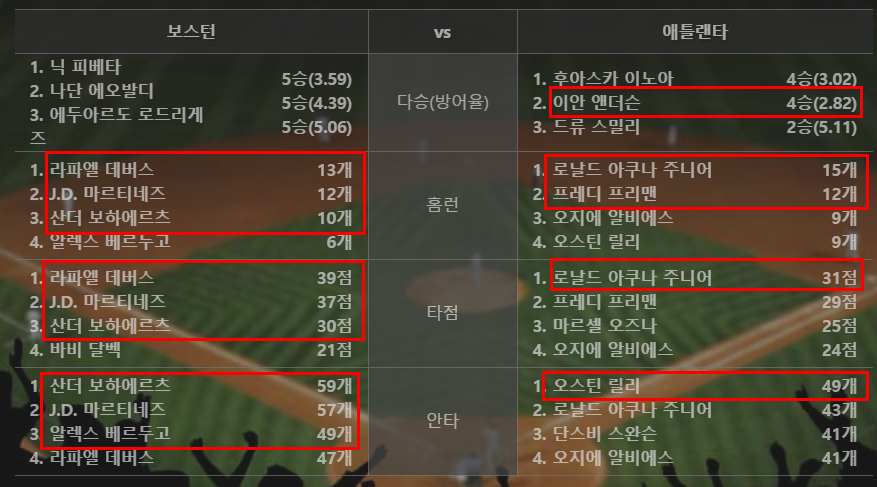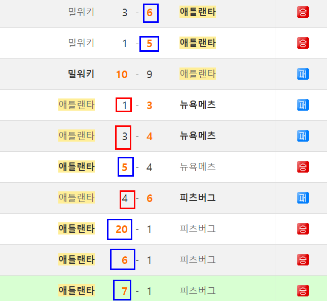 최근 흐름은 결과만 보면 보스턴이 7승 3패로 좀 더 좋지만, 과정은 66득점 34실점인 애틀랜타가 훨씬 뛰어나다.