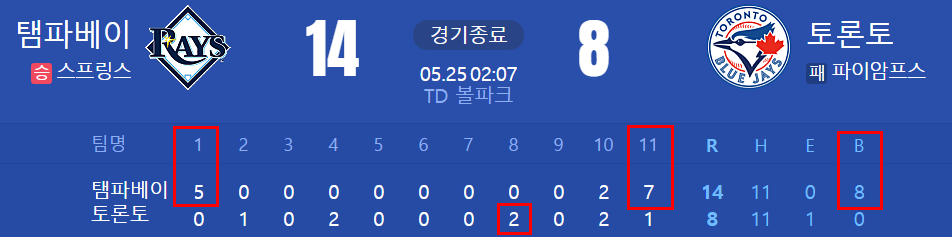 토론토는 어제 에스피날의 실책에 이어 오늘도 3루수 실책을 2아웃에 저지르면서 뒤이어 만루홈런이 터지며 게임이 시작부터 터질뻔했으나, 원래 선발예정이였던 스트리플링이 뒤이어 등판하는 감독의 패착으로 스트리플링이 7이닝 무실점을 거두면서 경기는 알수없게 흘러가다가 8회에 게레로주니어의 두번째 홈런인 동점 투런포로 경기는 5:5 동점. 실시간으로 시청하던 나는 좌절을 또다시 맛보았지만, 어제 류현진경기와 마찬가지로 연장에서 토론토 불펜진이 볼넷과 함께 제구난조를 틈타 11회 템파가 7득점을 퍼부으며 완전히 토론토를 넉아웃시켯다.