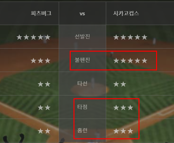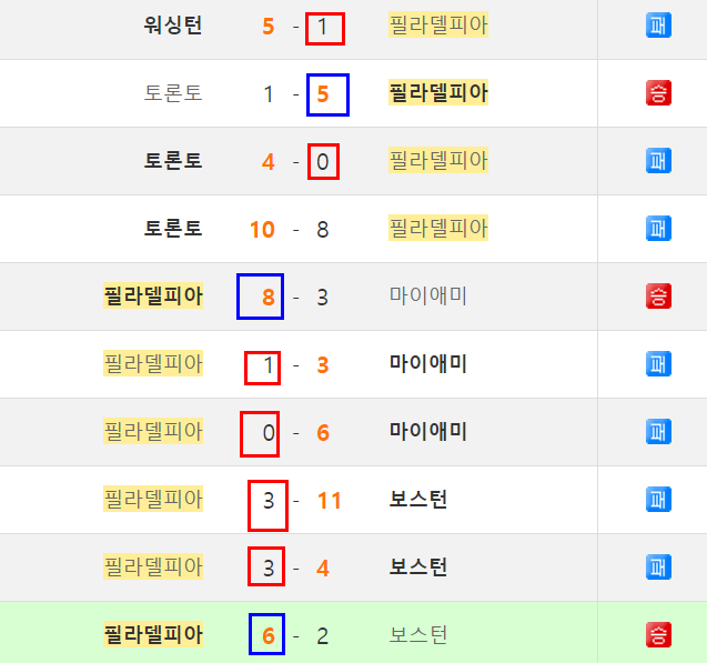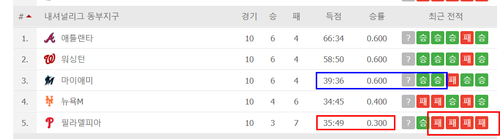 10경기 성적이 차이가 많이 난다. 하지만 예상외로 득점크게 차이가 나지않은대신 실점을 더 많이한 필라의 투수진이 옅어보인다.