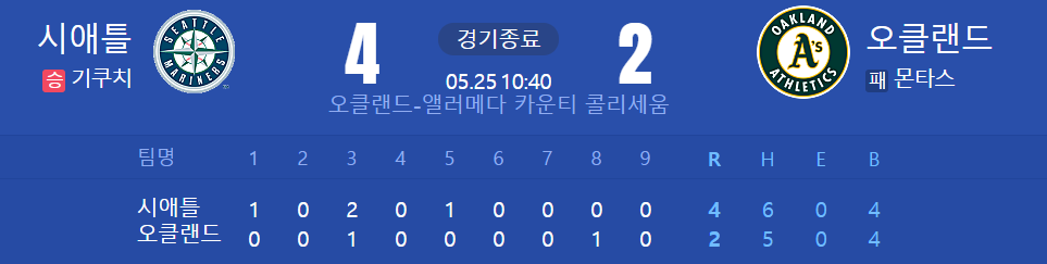 몬타스가 홈런 2방에 울었다. 11삼진을 빼앗으면서 구위를 자랑하는데 만족해야했다. 키쿠치는 6이닝 1실점으로 최근 맞대결전적 호투기록을 4경기째로 갱신하며 호구잡는데 성공했다.