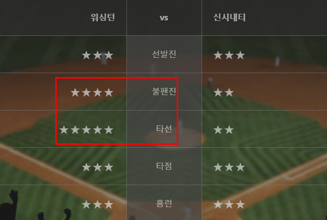 워싱턴 불펜이 좋고 타선이 특히 아주 강하다고 나왔다.