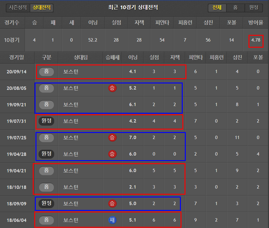 역대 보스턴 맞대결 성적도 신통치 않았다. 호투하는 경우만큼 실패한 경우가 많았지만 의외로 패전기록이 없다?!!??