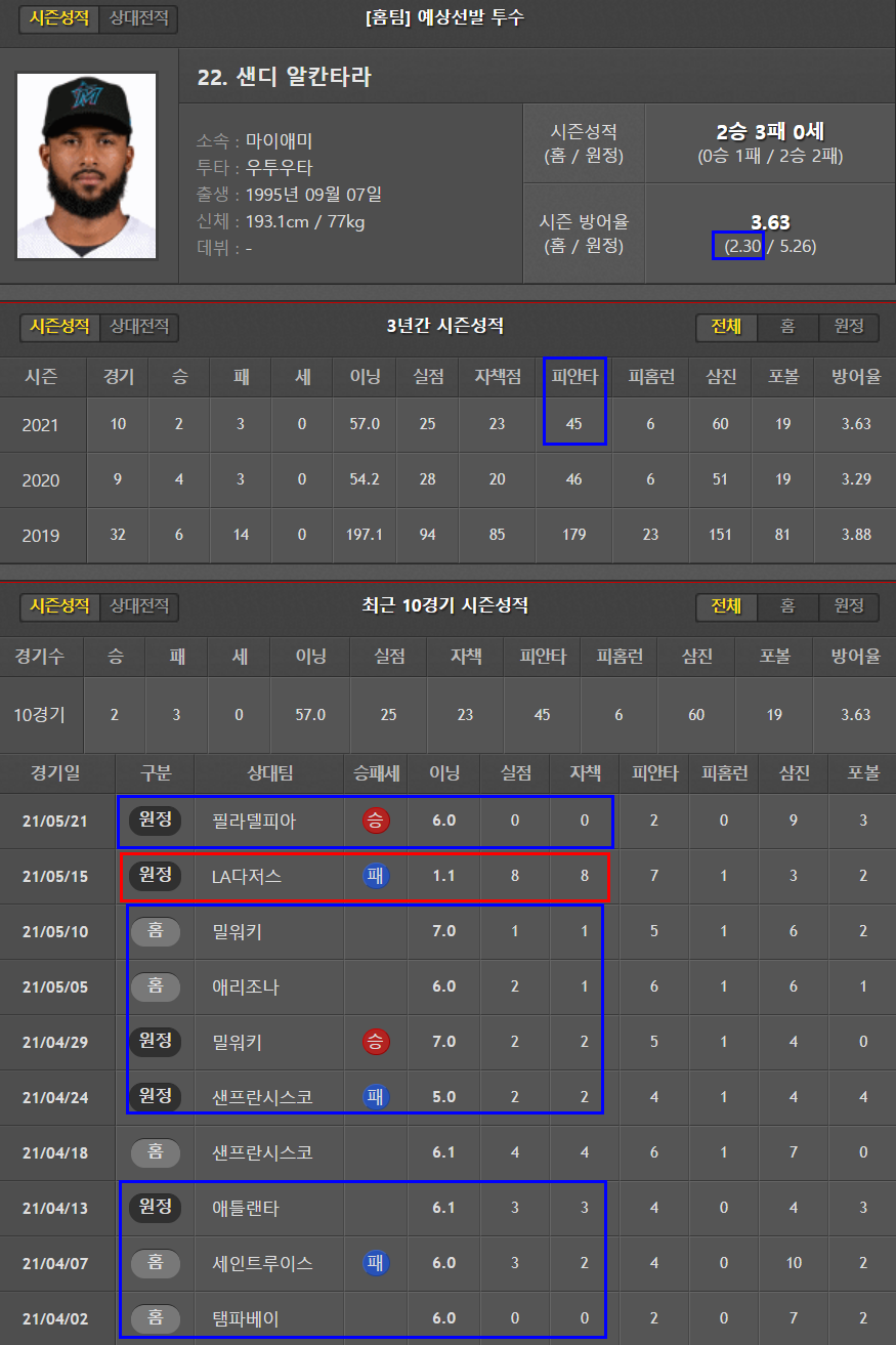 홈에서 슈퍼에이스모드인 알칸타라. 다저스를 만난 경기는 어쩔수없을정도로 요즘 다저스의 기세가 무서운건 다들 알거고.. 샌프도 그땐 강했으니까... 직전 경기인 필리스와의 대결에서 6이닝 2피안타 무실점으로 꽁꽁 틀어막았다는건 호재다.
