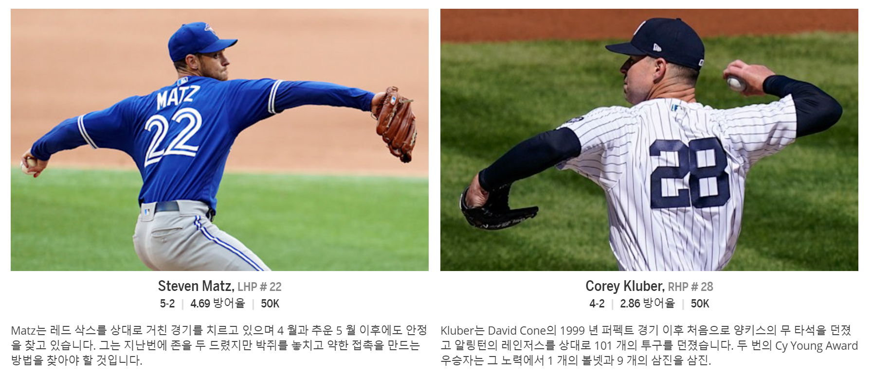 팀분위기가 완전히 상반된 두팀이다. 선발싸움에서 일단 양키스가 우세한데, 토론토가 흐름이 매우 좋진 않지만 타선만큼은 불타오르고 있는 상태다. 하지만 그렇다고 마츠가 호투할것같지도않다. 토론토는 불펜때문에 계속해서 다득점을 하고도 경기를 지고 있다. 후반으로 갈수록 양키는 유리해진다. 쉽게 양키스 승리를 점칠수있으며, 여유있다면 핸승까지 노릴수있겠다. 토론토의 타선의 분위기 만큼은 워낙 뜨겁고 최근 양키스도 불펜이 실점을 하면서 핸승을 가져가지 못한 경험이 있기에 핸승을 과감하게 추천하기는 조금 꺼려지는 부분이 있다.