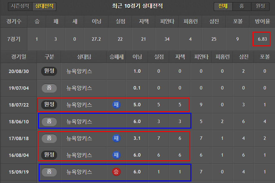 통산 양키스전적은 최근기록은 없지만 매우 좋지못하다.