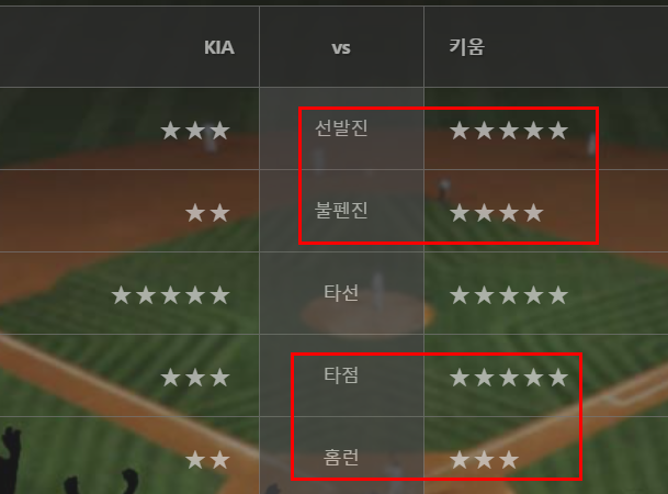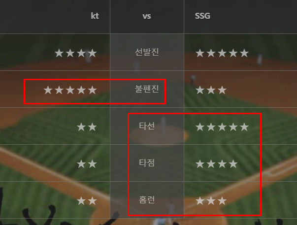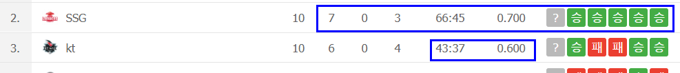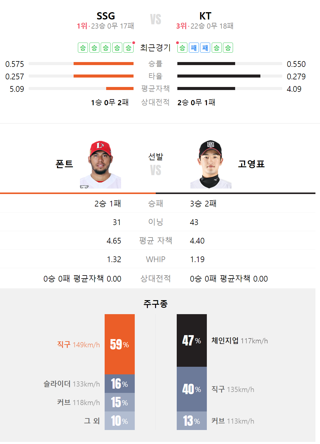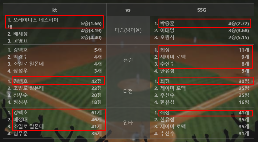 어느새 슬슬 대포군단이 재정비를 완료해가고 있다. 최주환의 복귀와 타율을 올리고 있는 추신수. 선봉에서 페이스를 더 끌어올리고 있는 최정. 뒤에서 하나씩 쳐주는 로맥까지 SSG의 기세가 무섭다. 반면 KT는 강백호의 원맨팀에 가깝지만 배정대와 알몬테, 장성우, 박경수가 어렵사리 뒷받침을 해주는 모양새다.