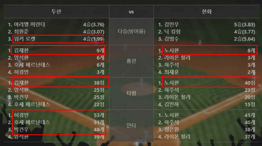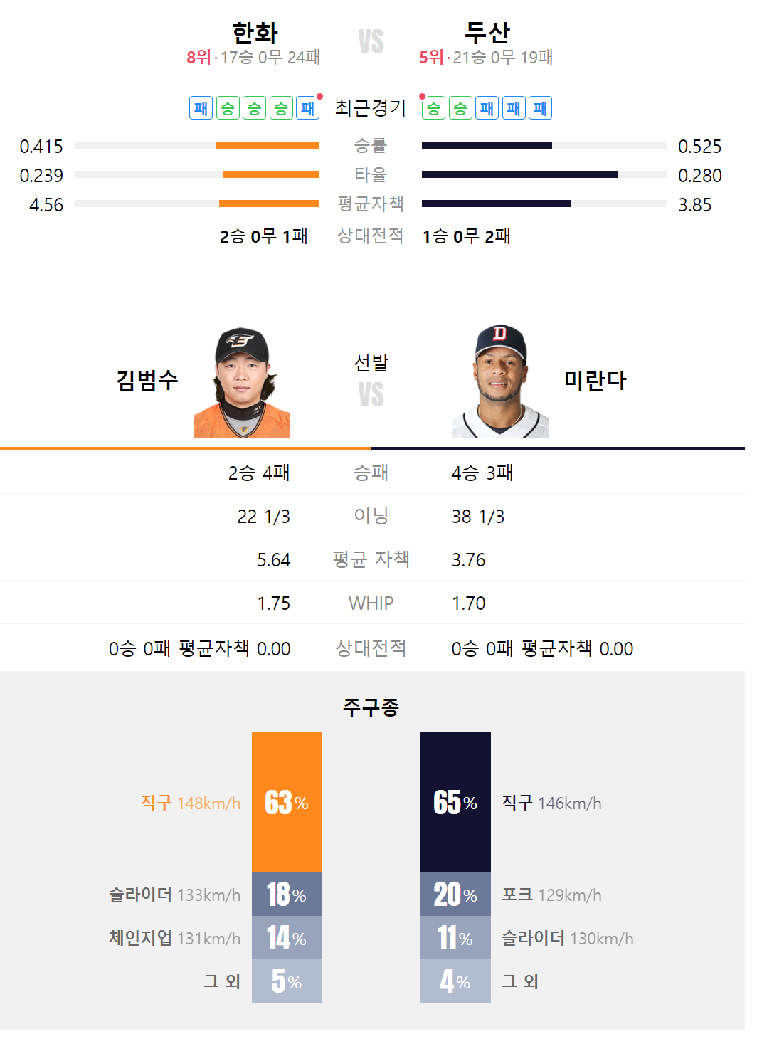 첫 한화전. 최근 롤러코스터에 재미들린 미란다. 무사사구 경기가 없는 잔혹함을 선사하는 중이다. 기본적으로 2개이상 볼넷을 내주지 않으면 입에 가시가 돋는 타입. 덕분에 상대팀의 득점확률이 매우 높다. 한화 수베로 감독은 OPS를 매우 중시하는 감독으로 정은원을 완벽한 출루형 리드오프로 만들어냈다. 미란다는 이런 부분에서 흔들릴 가능성이 매우 크다.