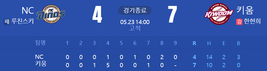 키움승. 키움핸승 - (루친스키 낮경기 기록 나쁨 적중 : 6이닝 5자책)