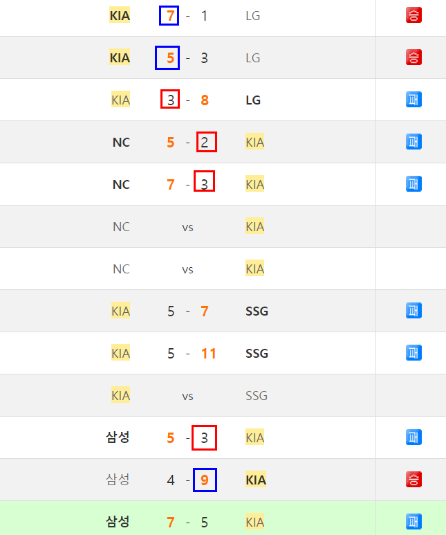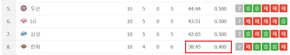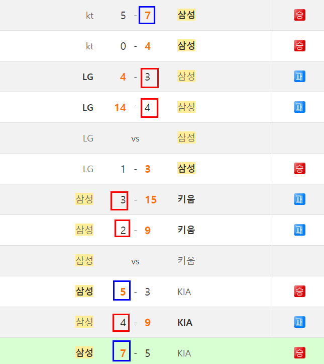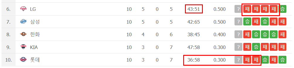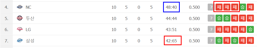 최근 10경기 5승5패로 같지만, 삼성이 더많은 실점을 했다.