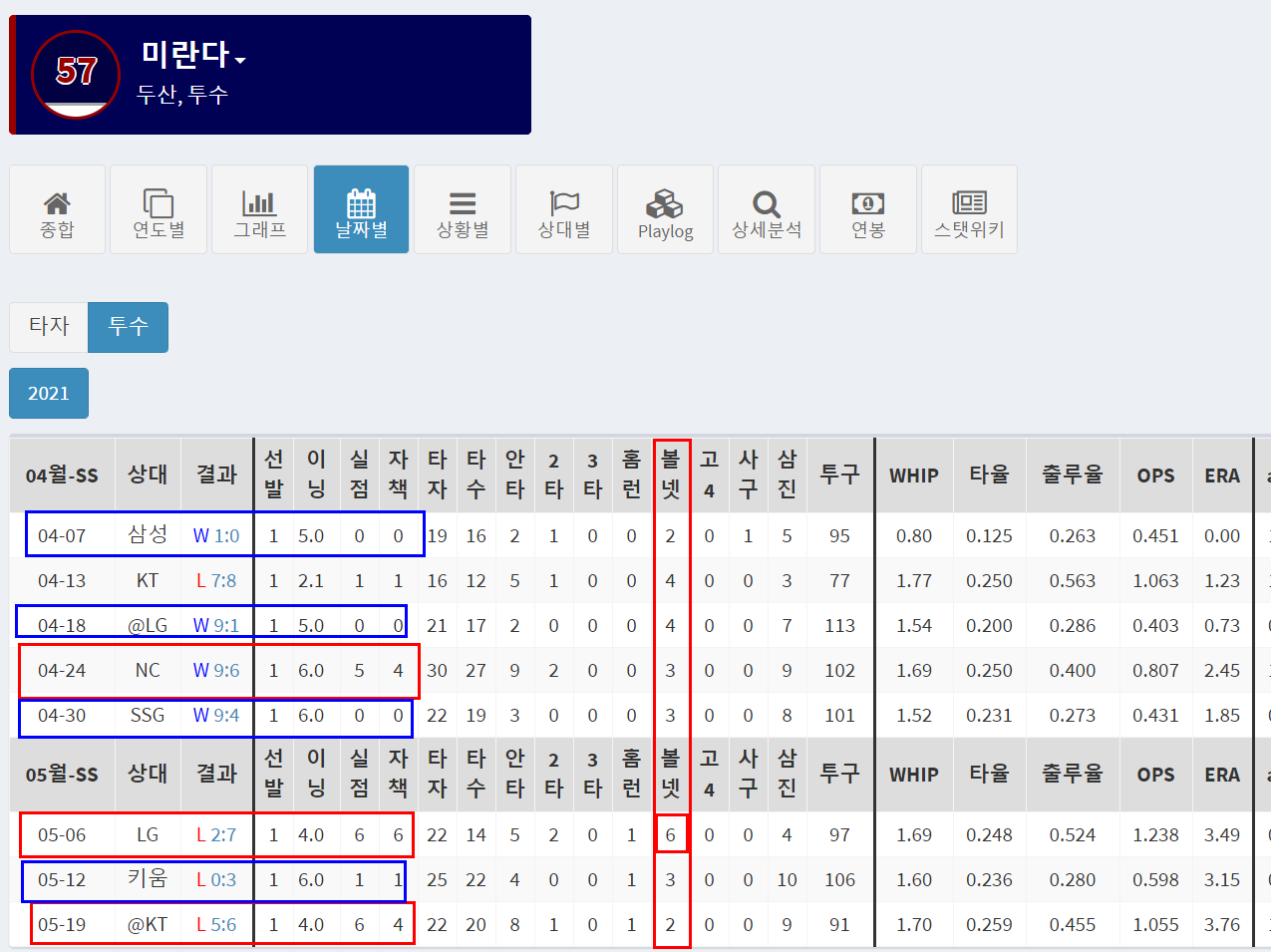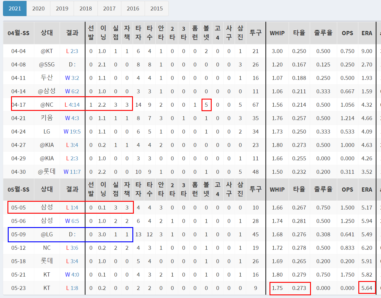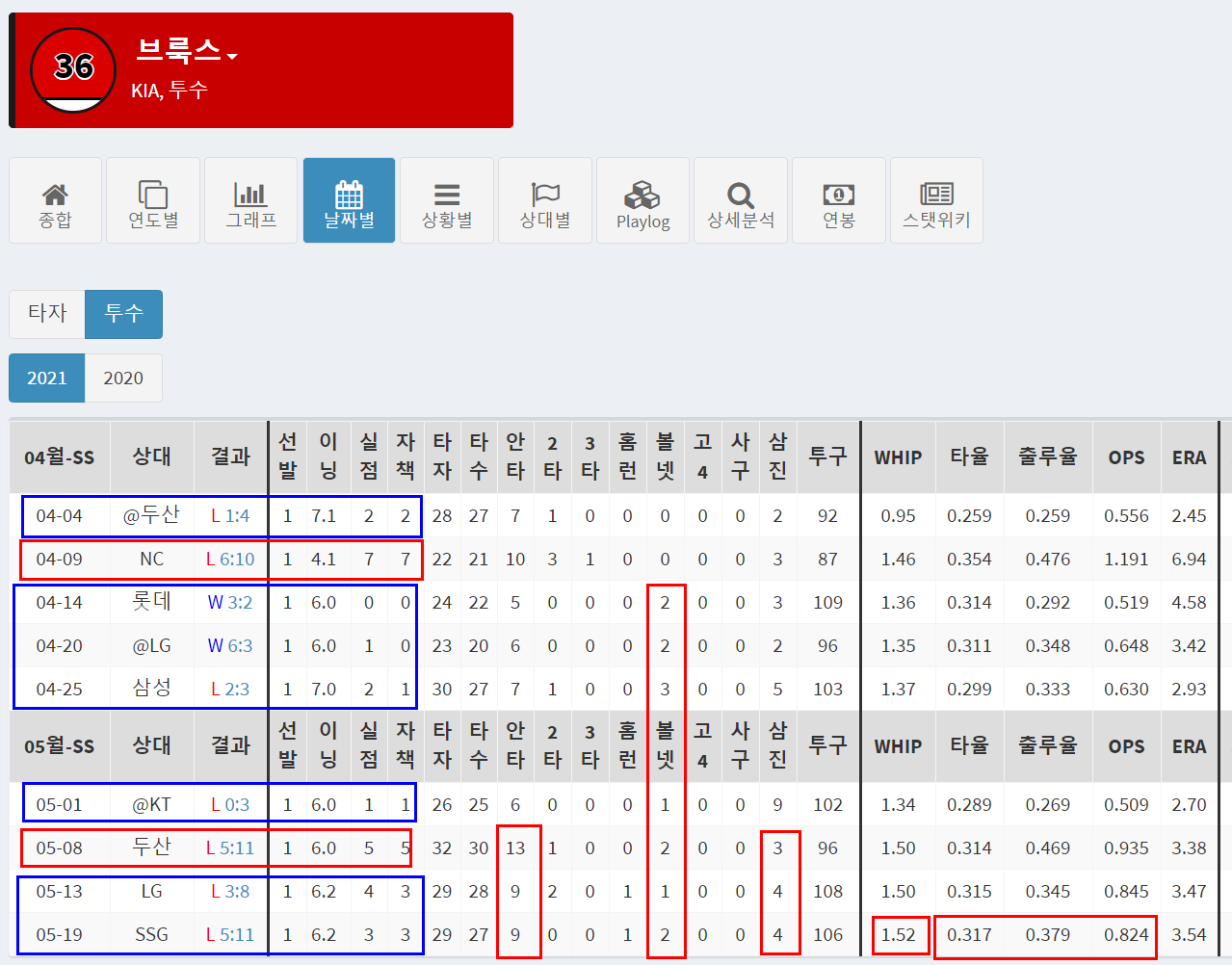 개막후 백쇼모드를 즐기다가 급격하게 난조를 보이고 있다. 최근 4경기에서 모두 5이닝을 소화하면서 힘들게 버텨냈다. 특히 지난 4월 29일 NC전에 5이닝 5실점으로 패전을 기록한바 있다. 세부수치 또한 매우 좋지않다.