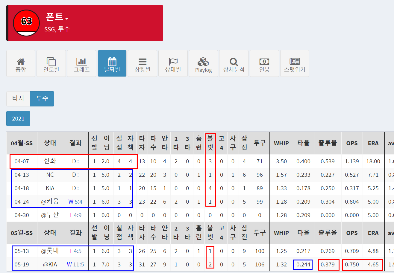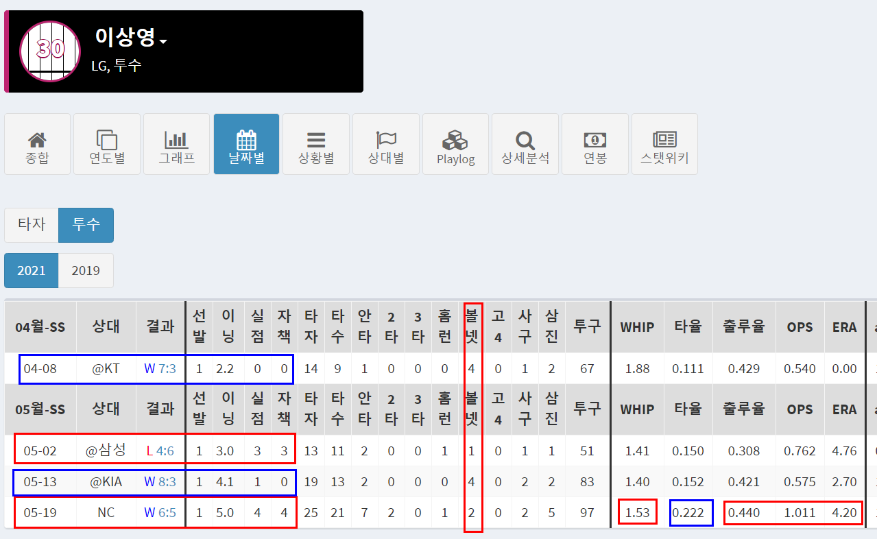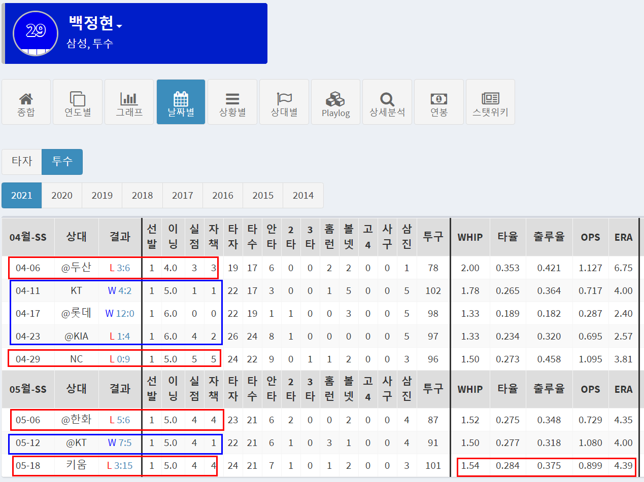 개막후 백쇼모드를 즐기다가 급격하게 난조를 보이고 있다. 최근 4경기에서 모두 5이닝을 소화하면서 힘들게 버텨냈다. 특히 지난 4월 29일 NC전에 5이닝 5실점으로 패전을 기록한바 있다. 세부수치 또한 매우 좋지않다.