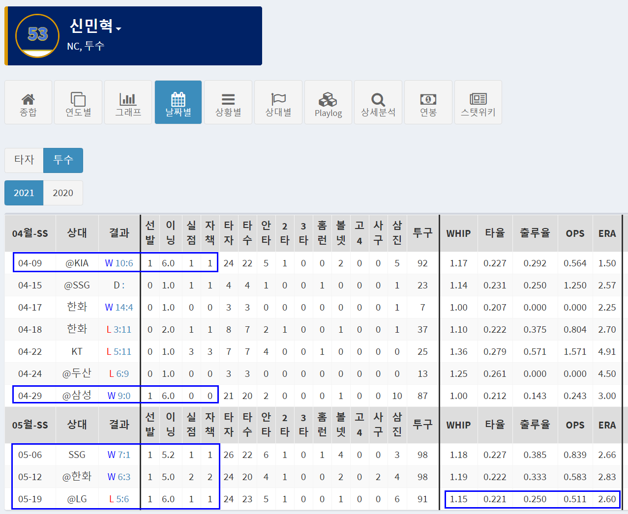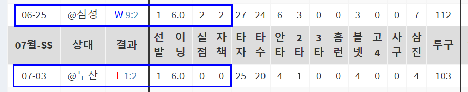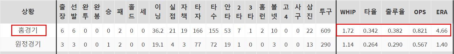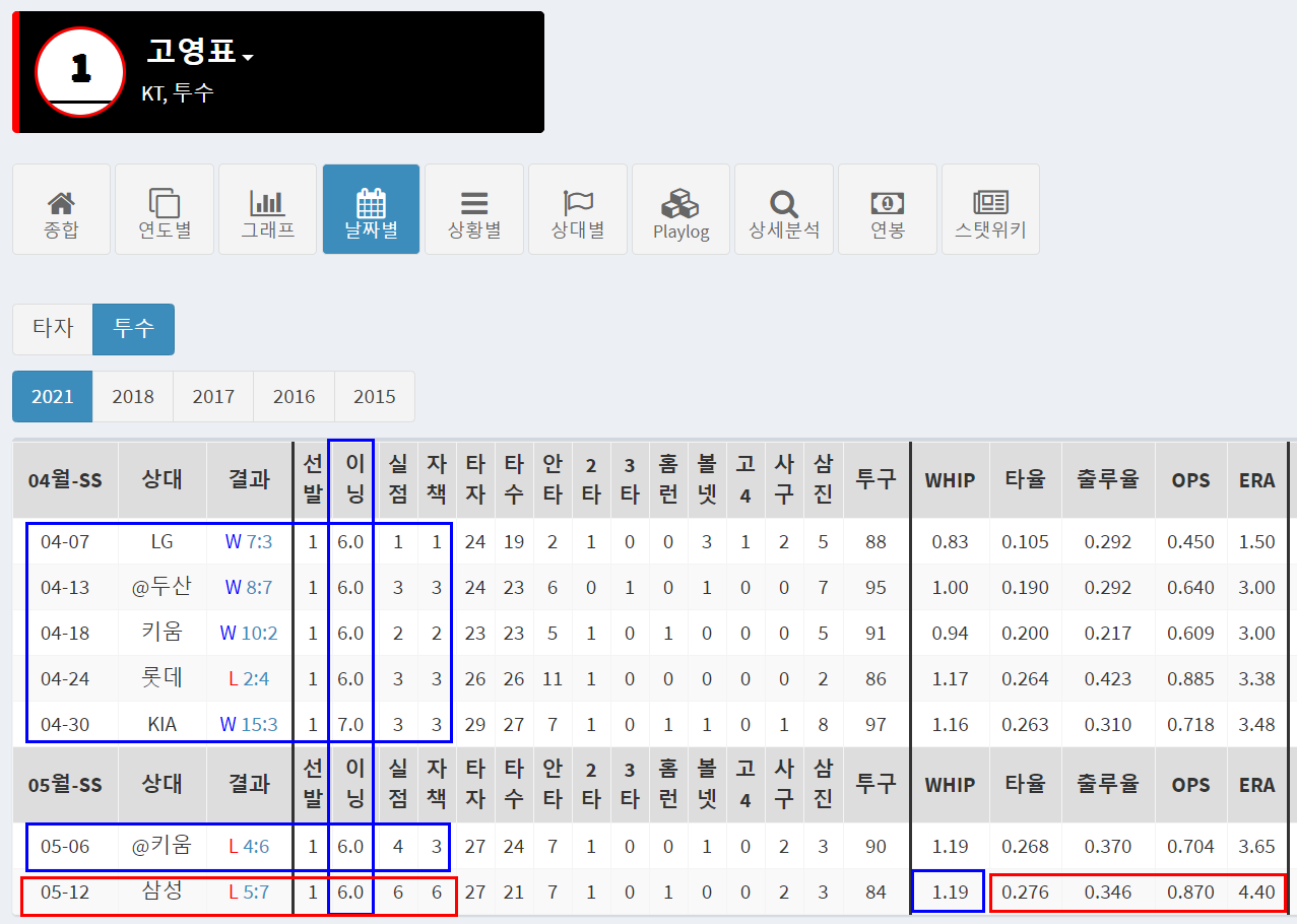 한결같다. 지속적으로 6이닝이상 던지고 있다. 그리고 고영표는 아직 무실점 경기가 없다. 다만 최근 들어 피안타가 급격히 상승하면서 공략당하고 있어, 피타율, 피출루율, 피 ops역시 급격하게 상승했다는 점은 그리 반가운일이 안니다. 상승세의 슥타선을 만나서 역시 무실점할 가능성은 낮아보인다.