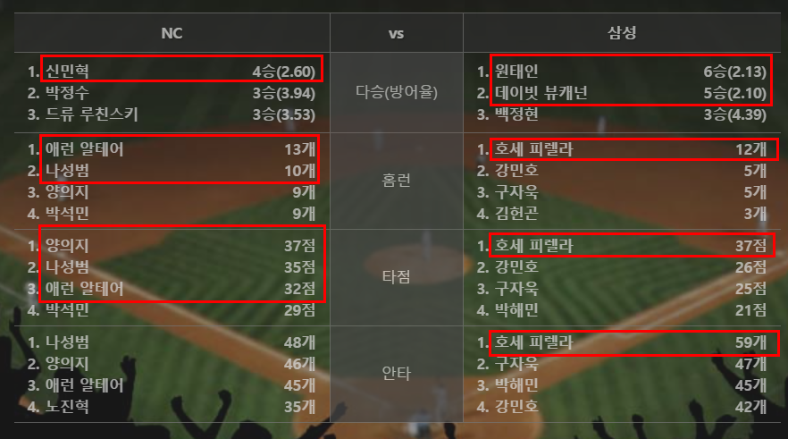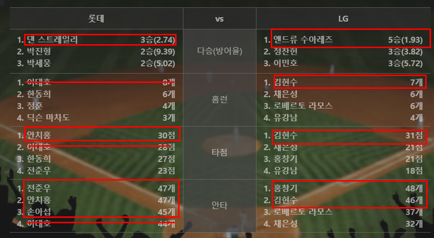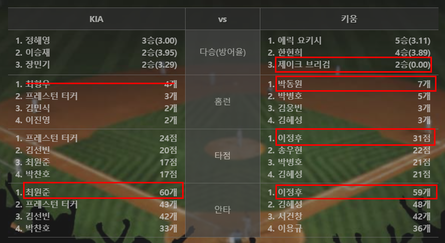 박병호가 삽질하는 사이 박동원이 미친듯한 장타력으로 원태인을 두들기기시작하면서 팀내 홈런 선두로 치고 올라갔다. 기아는 지난주에 콜업된 신인 이진영이 2경기 연속 홈런을 쳤을뿐인데 팀내 홈런순위권에 들었다.